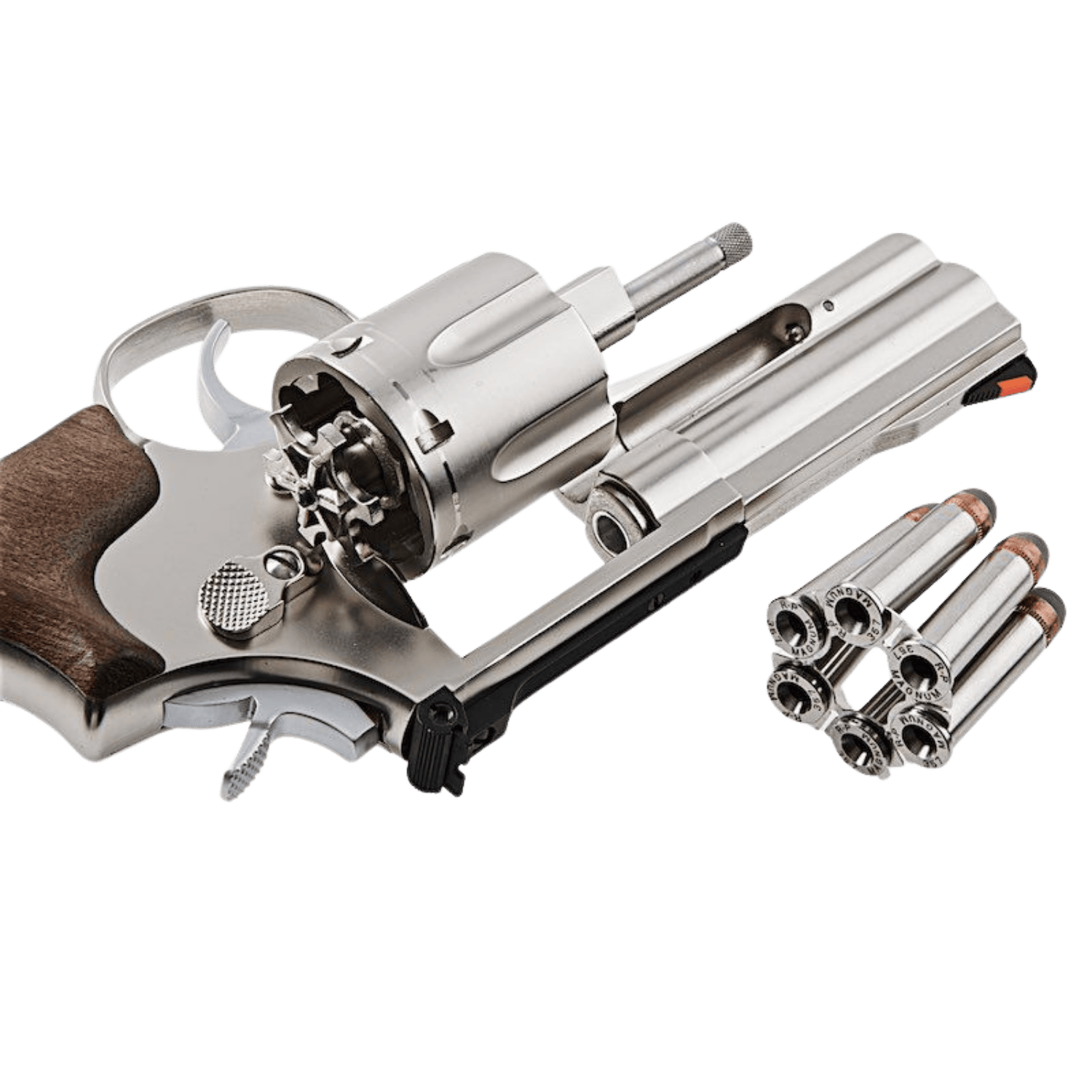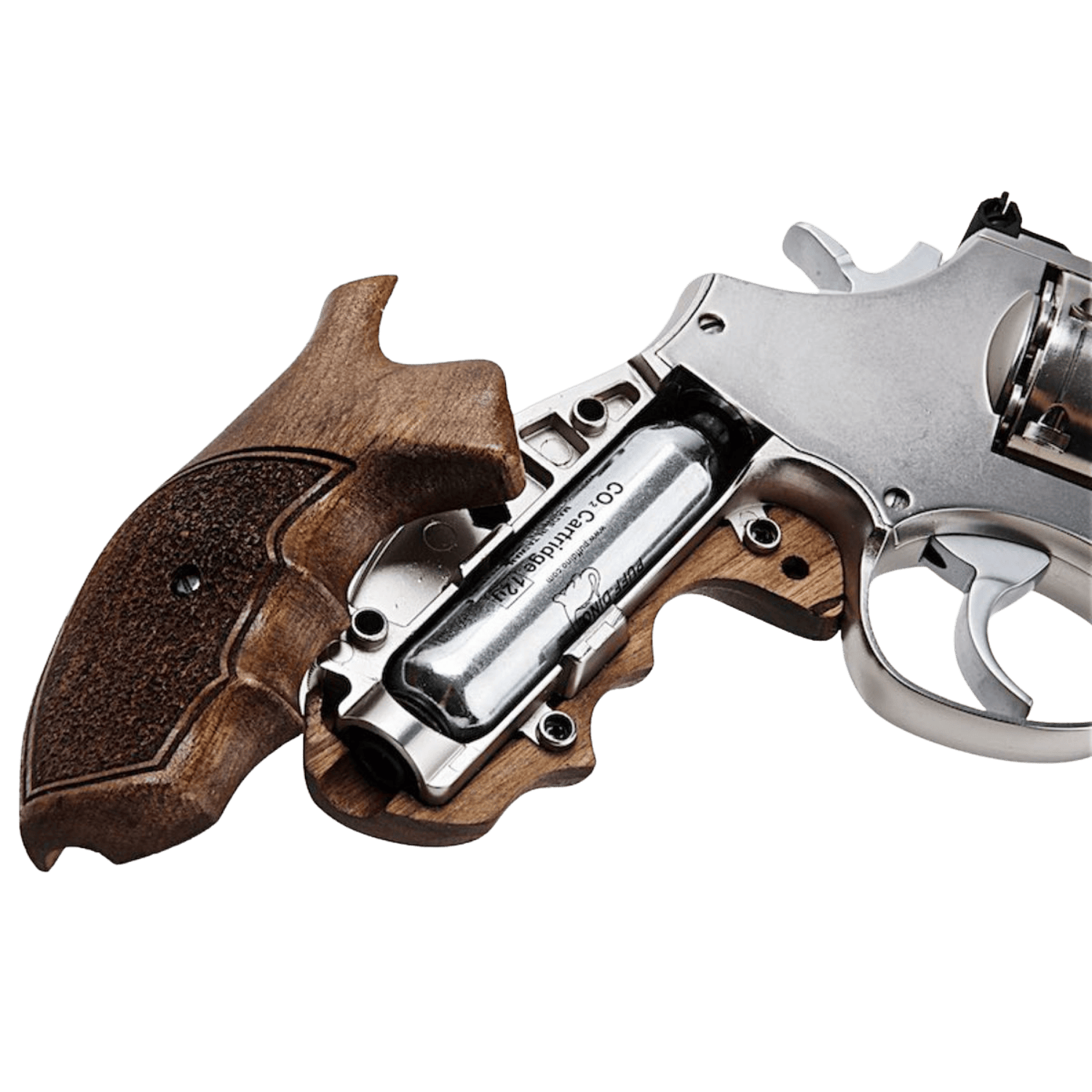 Smith & Wesson 686 platformundan ilham alan bu model, paslanmaz çelik görünümlü silver yüzeyi, gerçek ahşap dokulu kabza kapakları ve dengeli 3.5 inç gövde yapısıyla özellikle klasik toplu tabanca seven kullanıcılar için dikkat çekici bir seçenek oluşturur.
