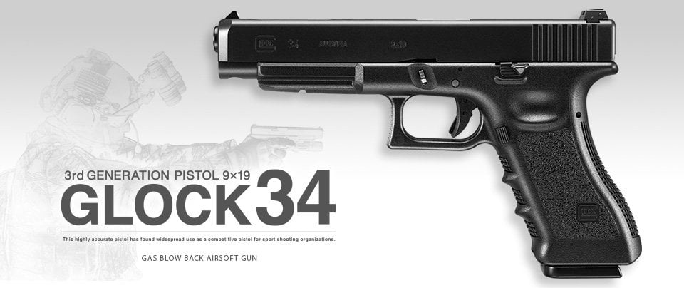 Tokyo Marui GLOCK G34 GBB Airsoft Tabanca, Glock serisinin hafif, dayanıklı ve güvenli kullanım anlayışını uzun namlu avantajıyla birleştiren, lisanslı ve yüksek işçilik seviyesine sahip bir gas blowback modelidir.
