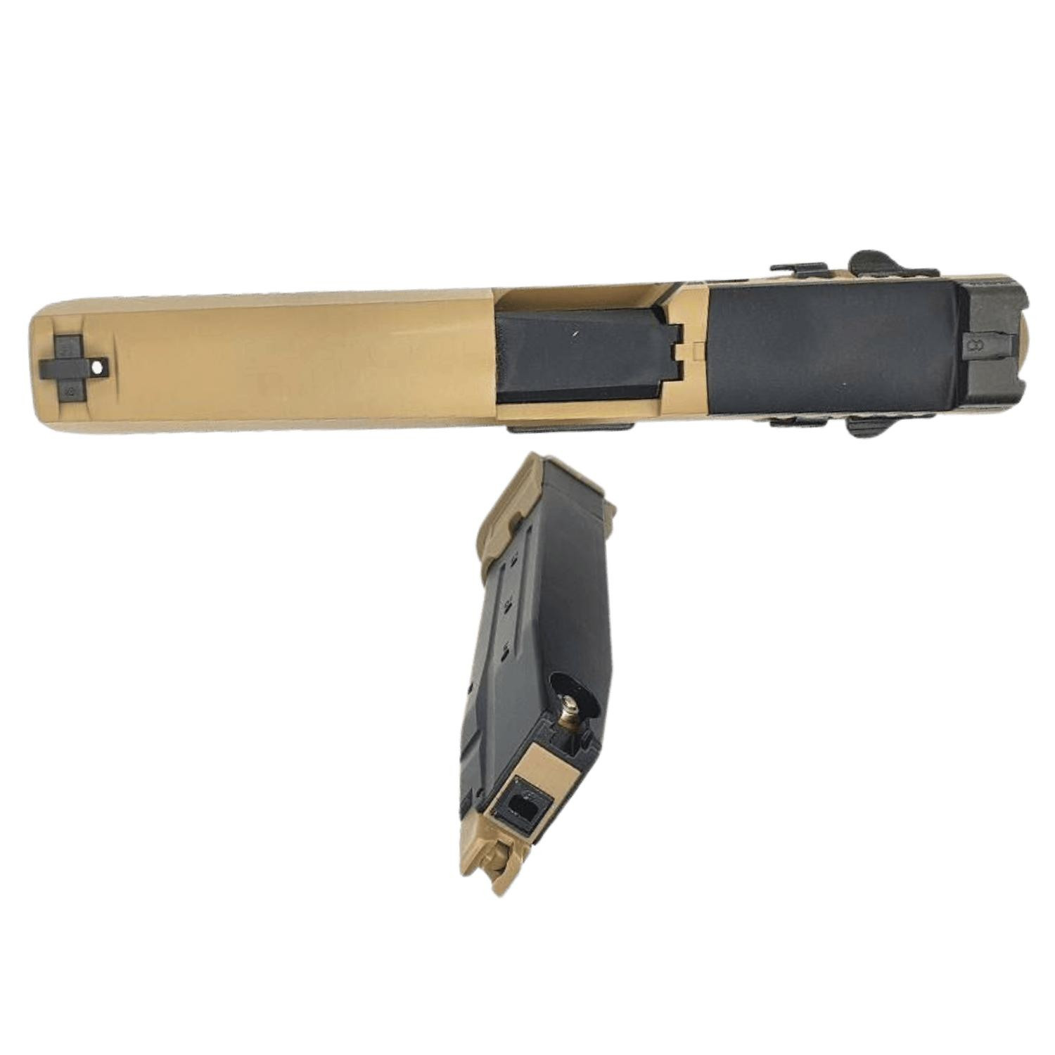 Modern “modüler” tabanca çizgisine yakın dış hatları, tan renk kombinasyonu ve metal sürgü yapısı ile hem koleksiyon hem de saha kullanımı için güçlü bir GBB seçeneği sunar.