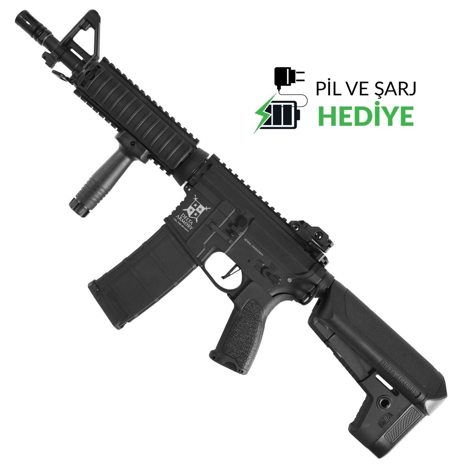 Delta Armory BRAVO CQB-R, ABS polimer gövde ve CNC işlenmiş metal quad-rail handguard sunan bir AR15/M4 AEG modelidir. İç aksamda SHS piston (14 tam metal diş), CNC metal cut-off delayer, 7 mm metal rulmanlar ve güçlendirilmiş metal gearbox bulunur. 6.03 mm precision iç namlu ve rotary hop-up ile kutudan çıktığı haliyle yaklaşık 380 FPS (0,20 g BB) performans verir. QRS Gen.2 hızlı yay değişimi ve hızlı motor değişimi ile bakım ve upgrade işlemleri pratiktir. Üst 22 mm RIS ray, sabit metal ön nişangah, 2× RIS kapak ve metal dış namlu ucu (14 mm sola diş) erişilebilirlik sağlar. Pil dipçik içine kolayca yerleştirilir. Paket, tüfek, DMAG 120 rd mid-cap şarjör, RIS handguard, 2× RIS kapak, 9.6V/1100 mAh pil ve şarj cihazı (LED, auto-stop) içerir.