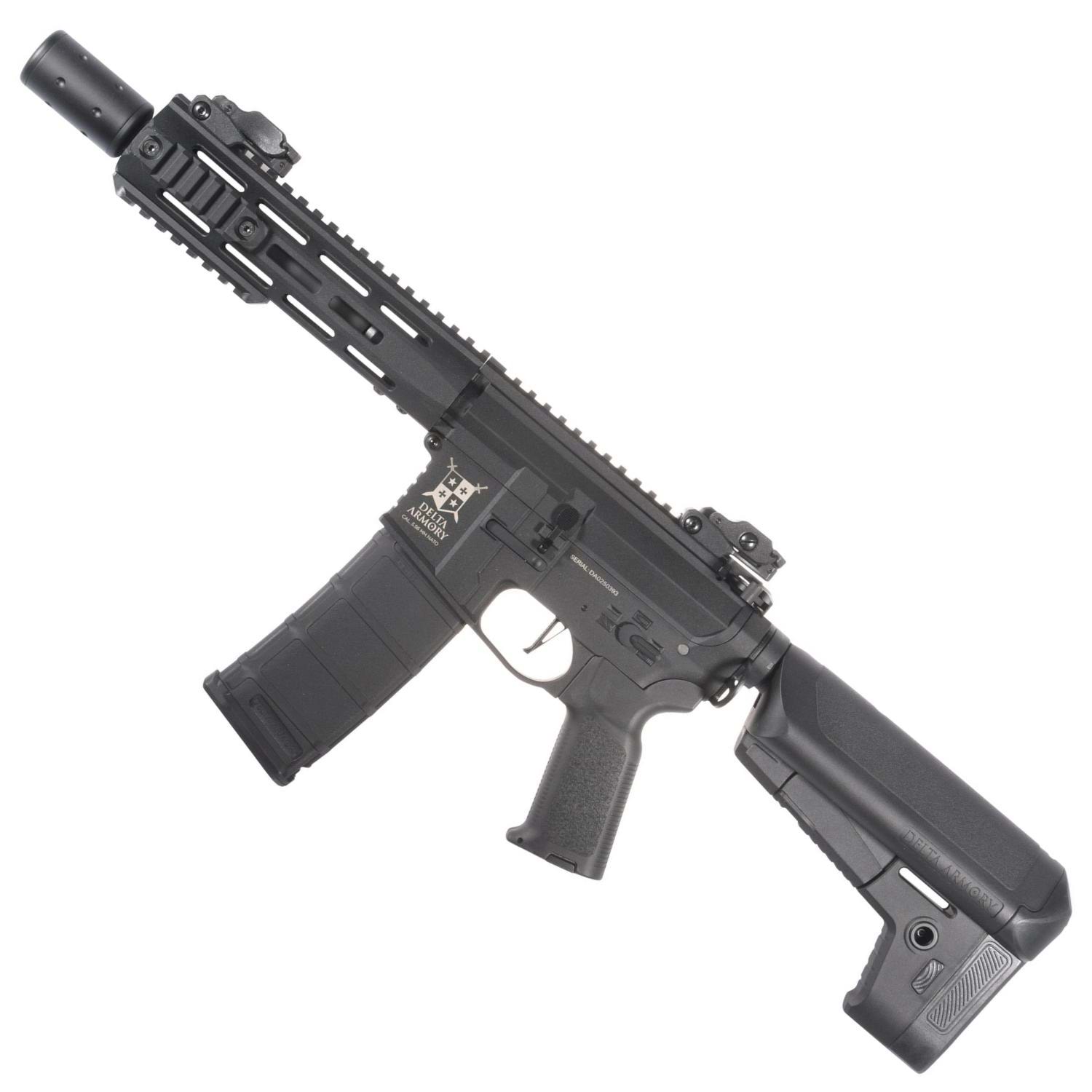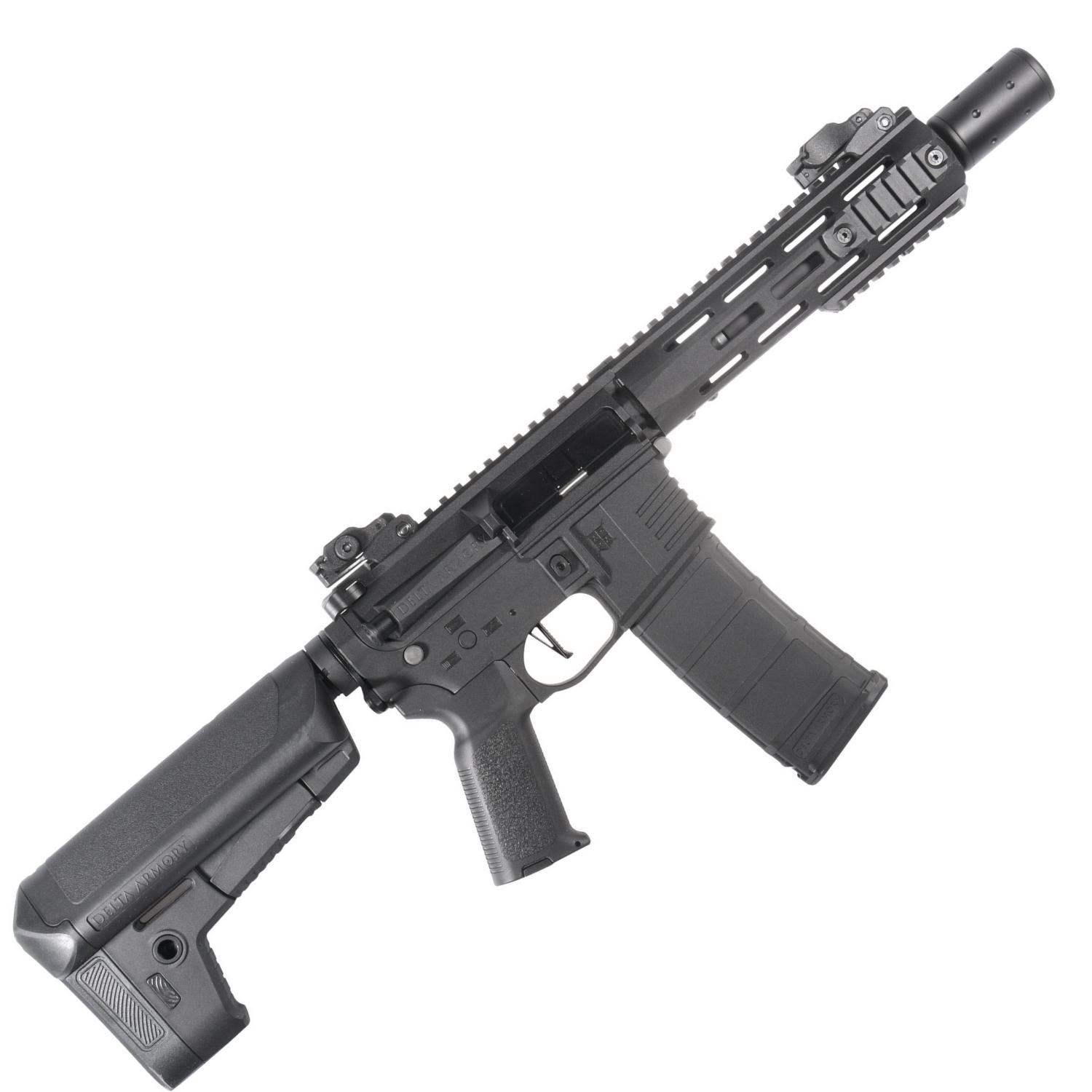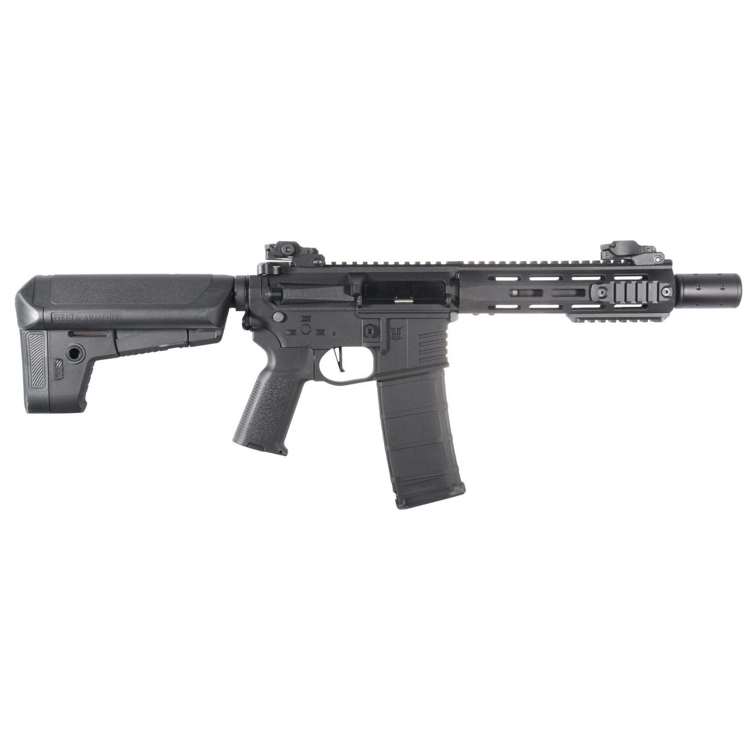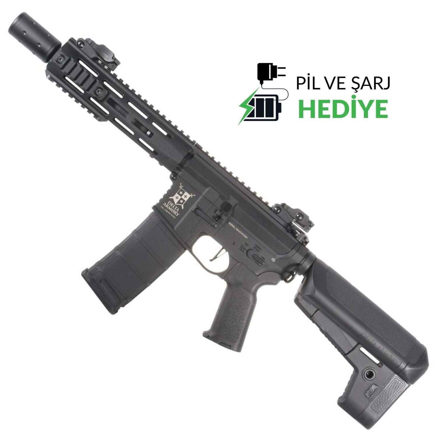 Delta Armory SilentOps 8" Charlie, yüksek performans ve dayanıklılık sunan AR15/M4 platformu AEG tüfektir. Dış gövde polimer malzemedir. İç aksam SHS piston (14 tam metal diş), güçlendirilmiş metal dişliler ve 8 mm metal rulmanlar içerir. 6.03 mm precision iç namlu ve rotary hop-up ile kutudan çıktığı haliyle güçlü isabet sağlar. QRS Gen.2 hızlı yay değişimi ve hızlı motor değiştirme fonksiyonları bakım ve upgrade işlemlerini kolaylaştırır. Ürün, içi köpüklü metal susturucu ile gelir; köpük çıkarılarak tracer modülü takılabilir. 22 mm üst RIS ray ve M-LOK el kundağı aksesuar çeşitliliği sunar. Yeni başlayanlar ve ileri seviye oyuncular için uygundur.