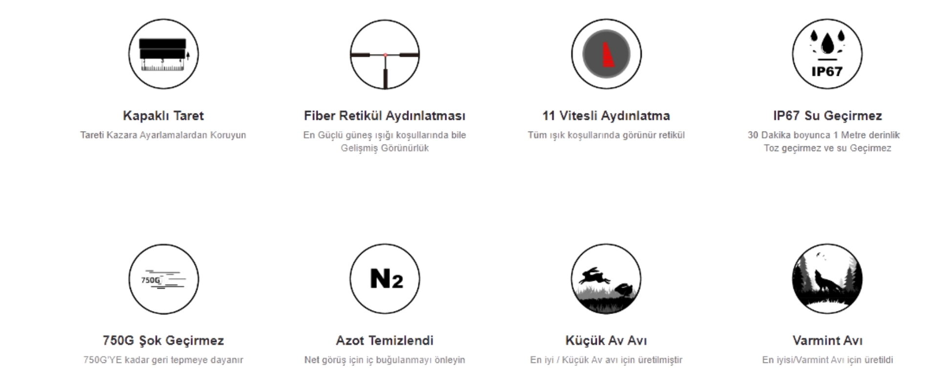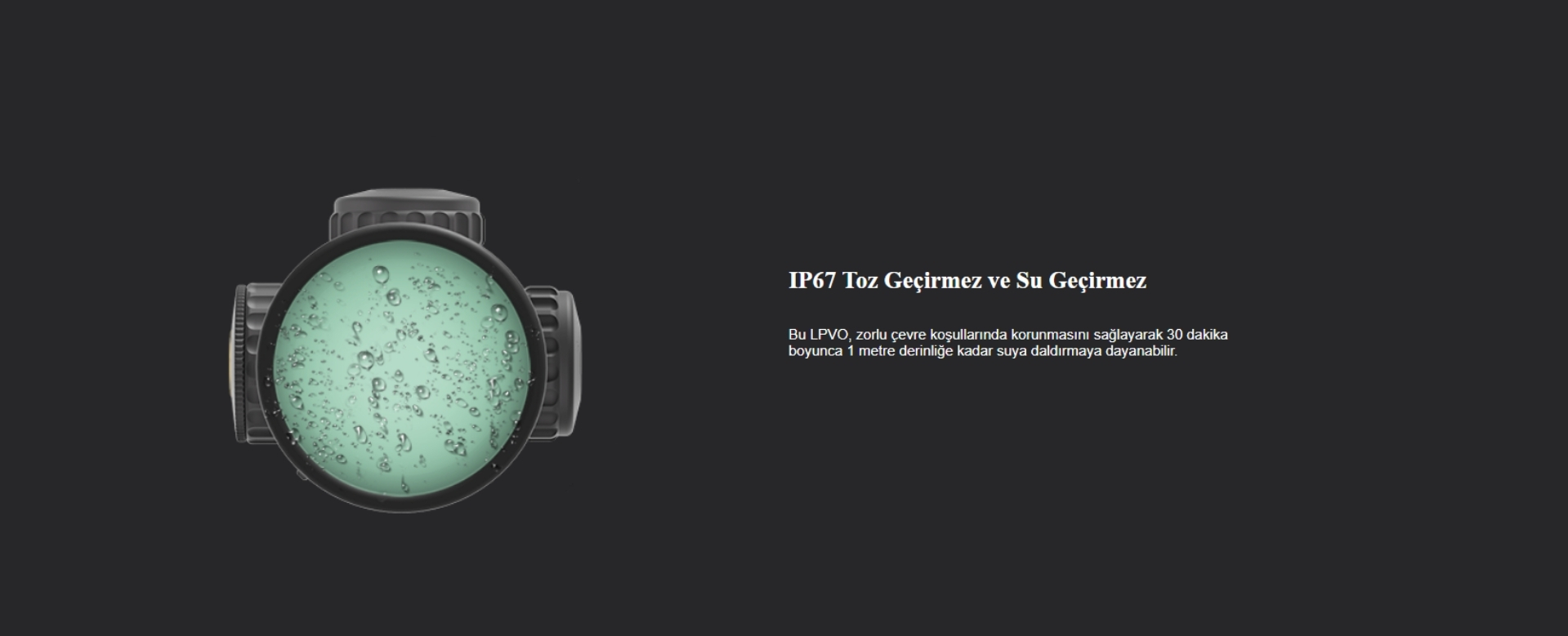 Paralaks tarafında 100 m sabit yapı belirtilir. Dayanıklılık tarafında IP67 su/toz dayanımı, buğu önler iç yapı ve 1000G darbe dayanımı vurgulanır (üretici beyanı). Üretici geri tepme testleri tarafında .223 / .308 Win / .3006 / .300 Win platformlarını belirtir.