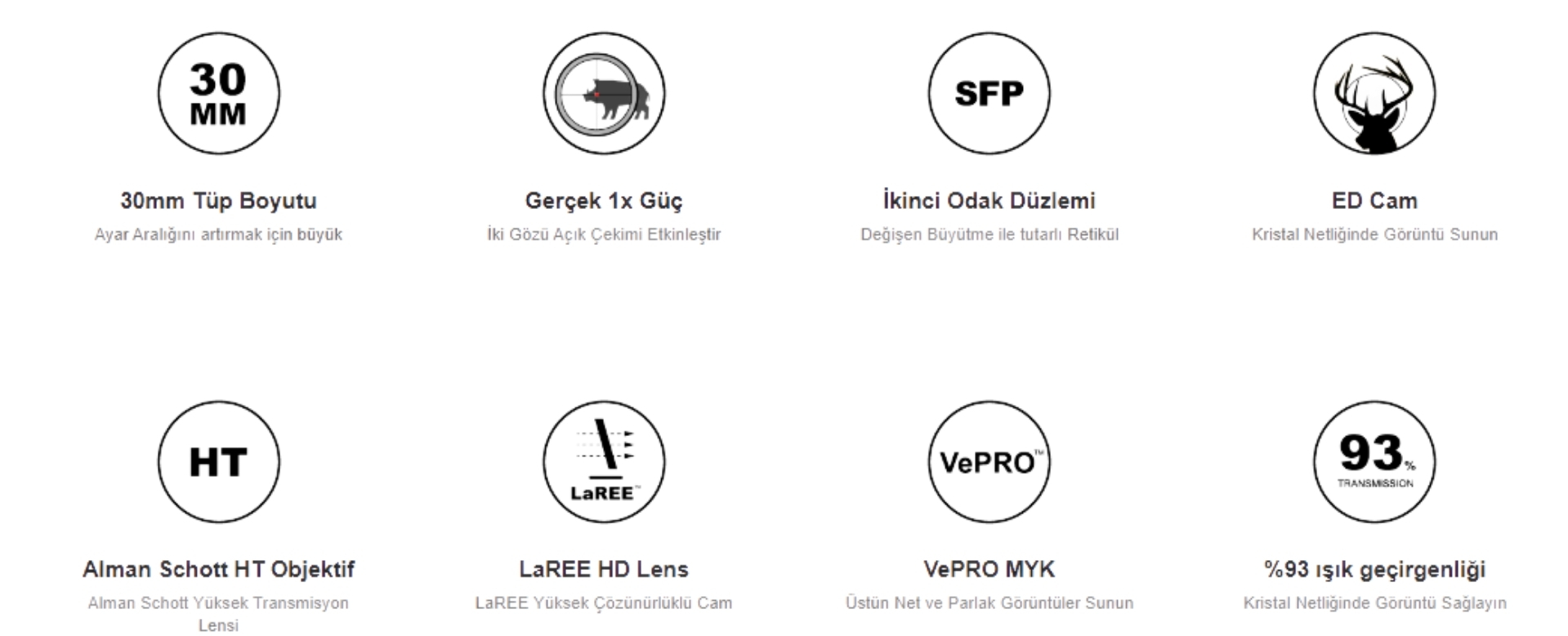 Optik tarafta üretici; Alman Schott HT cam altyapısı, LaREE lens yapısı, ED lens ve VePRO MYK kaplama yaklaşımı ile %93 ışık geçirgenliği vurgusu yapar. Tamamen çok kaplamalı lensler, yansımayı/parlamayı azaltıp daha net nişan ve daha yüksek kontrast hedefler.