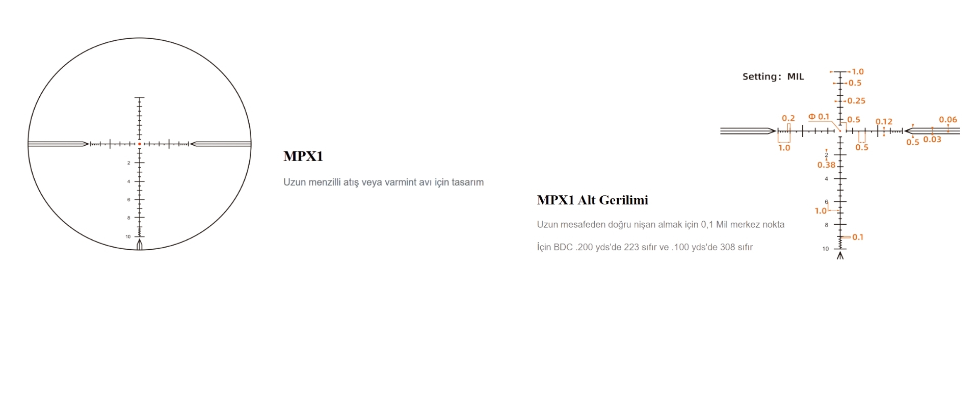 Dürbün İlk Odak Düzlemi (FFP) yapıdadır ve kazınmış cam MPX1 artıkıl, büyütmeyle orantılı çalışarak ölçüm mantığını daha tutarlı hale getirmeyi hedefler. Üretici, hassas hedefleme için 0,15 MIL merkez nokta vurgusu yapar. Merkez nokta aydınlatması 6 seviye kırmızı ışıklı olarak sunulur ve CR2032 pil ile çalışır.